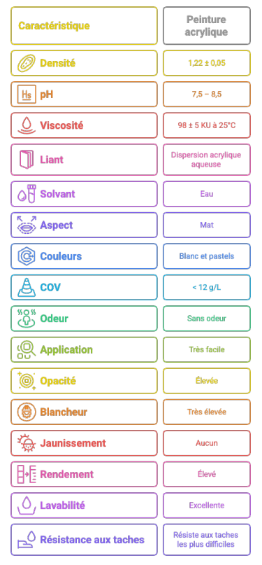 Peinture acrylique en phase aqueuse, mate et résistante aux taches, idéale pour les murs intérieurs soumis à un usage intensif.